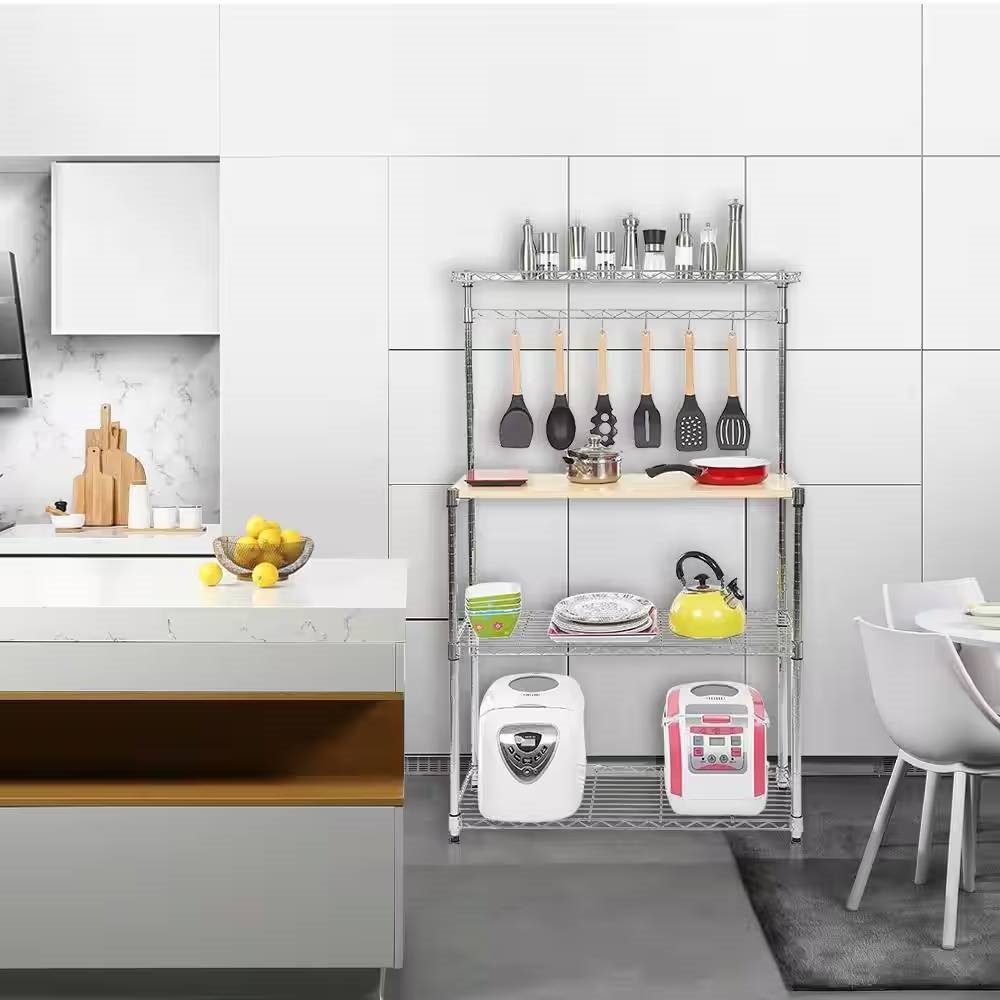 • Carbon Steel Kitchen Bakers Rack with MDF Wood Shelf and Hanging Bar with Hooks