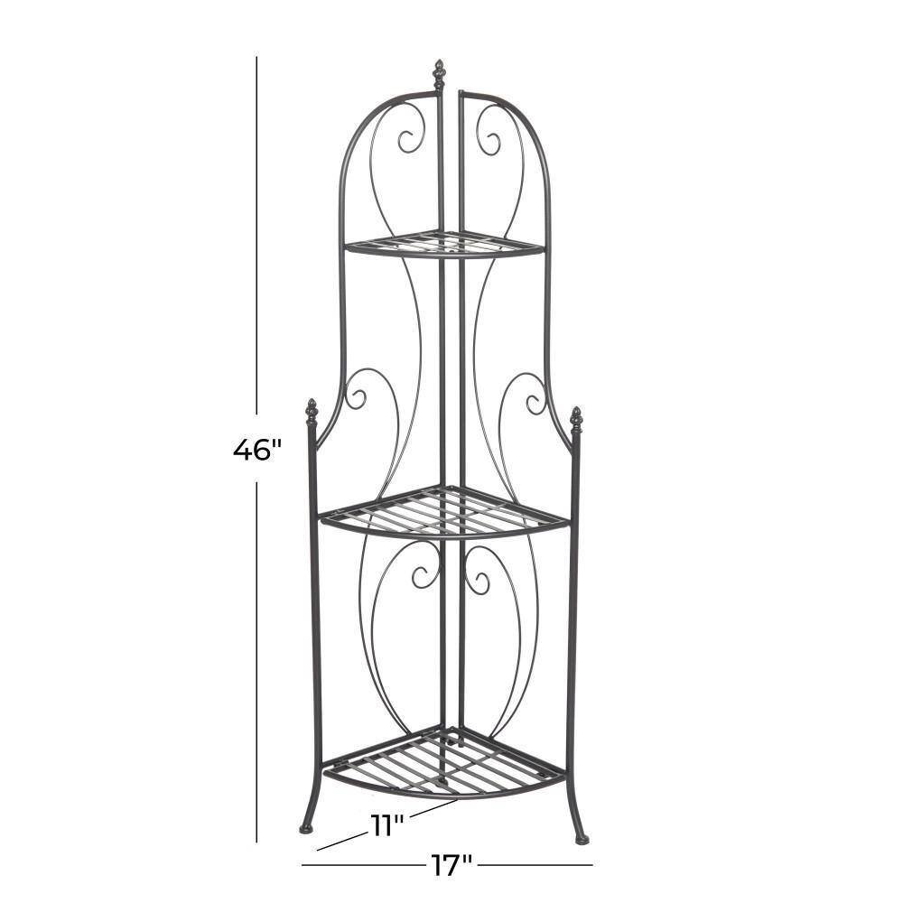 This Indoor/Outdoor 3-Shelf Black Metal Corner Bakers Rack Plant Stand is spacious to keep your valuables organized and safe. Appreciate their design best against solid-colored backgrounds. Create a sophisticated planter rack outdoor display as you decorate this 3 tier metal rack with solid white potted plants and ravishing stoneware sculptures. Designed with rubber footing at the base that prevents scratching, anti tipping, as well as sliding around. This item ships in 1 carton. Suitable for indoor and outdoor use. Avoid using abrasive cleaning pads or detergents, use a sponge with mild soap and warm water, then rinse with a garden hose.. This bakers rack features a 3 tier metal shelving unit. Industrial style. This bakers rack is made from solid iron construction with protective coating making it impervious to the elements with anti-corrosive properties.