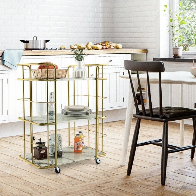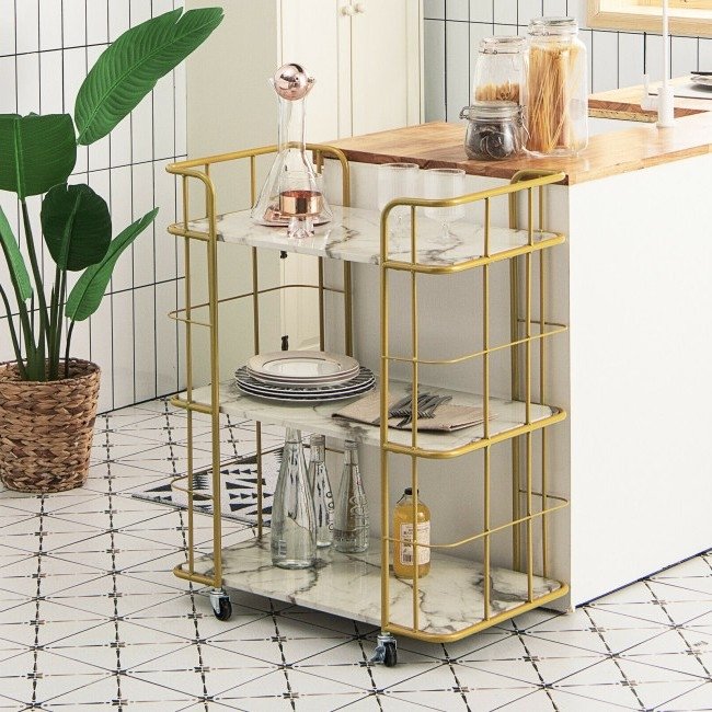 This 3 Tier Faux Marble Gold Rolling Bar Cart offers sufficient storage for food, wine, beverage, tableware and so on, which can well satisfy your storage needs. It's designed with beautiful gold frame and faux marble finish, which brings a touch of elegance to any room of your house. The kitchen utility cart is equipped with four 360‚àû swiveling casters for smooth rolling, including two casters with brakes. Made of rust-resistant steel and high-quality MDF, the serving cart is solid and durable. Each shelf can bear a weight up to 55 lbs.